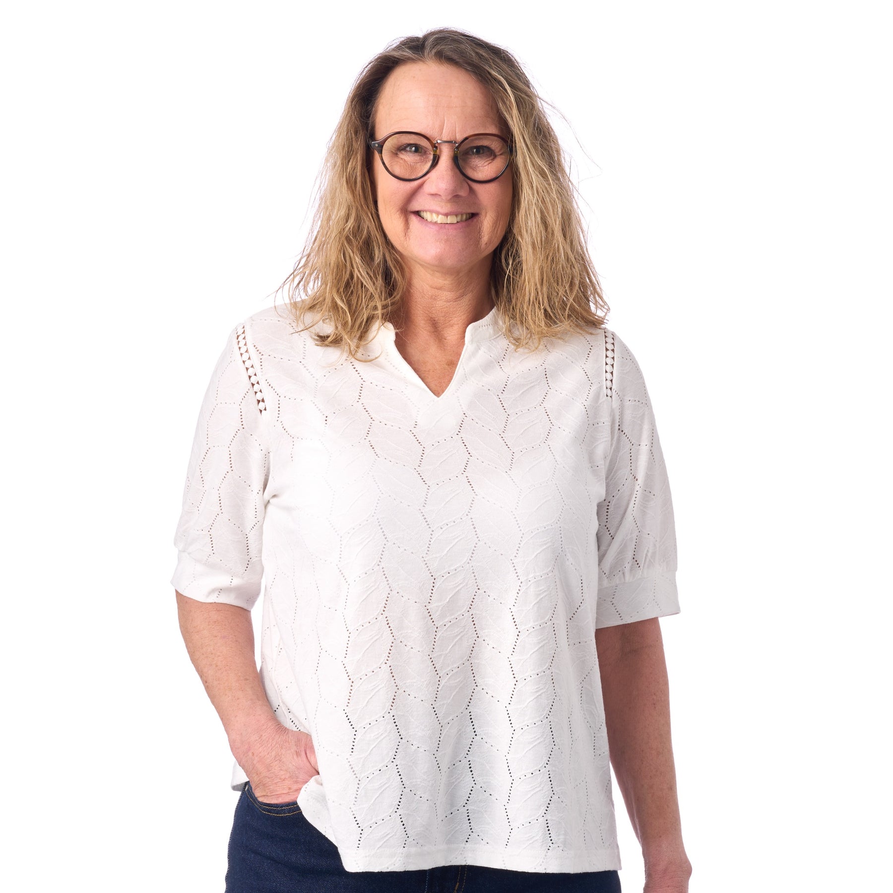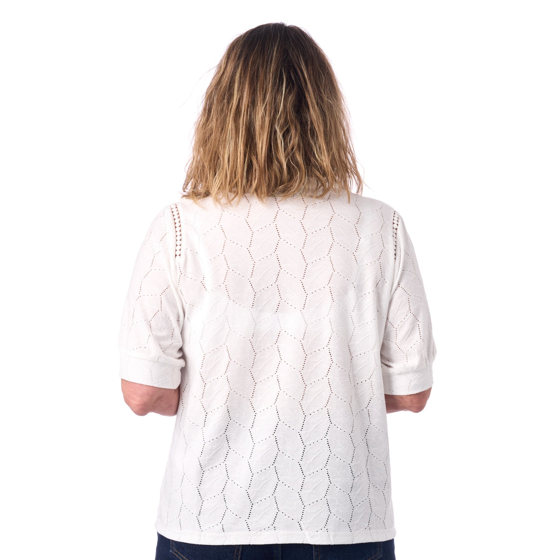 Det bølgende hulmønster løber elegant over hele toppen og giver den et feminint og gennemarbejdet udtryk. Ved skuldrene løber en dekorativ hulmønsterbort