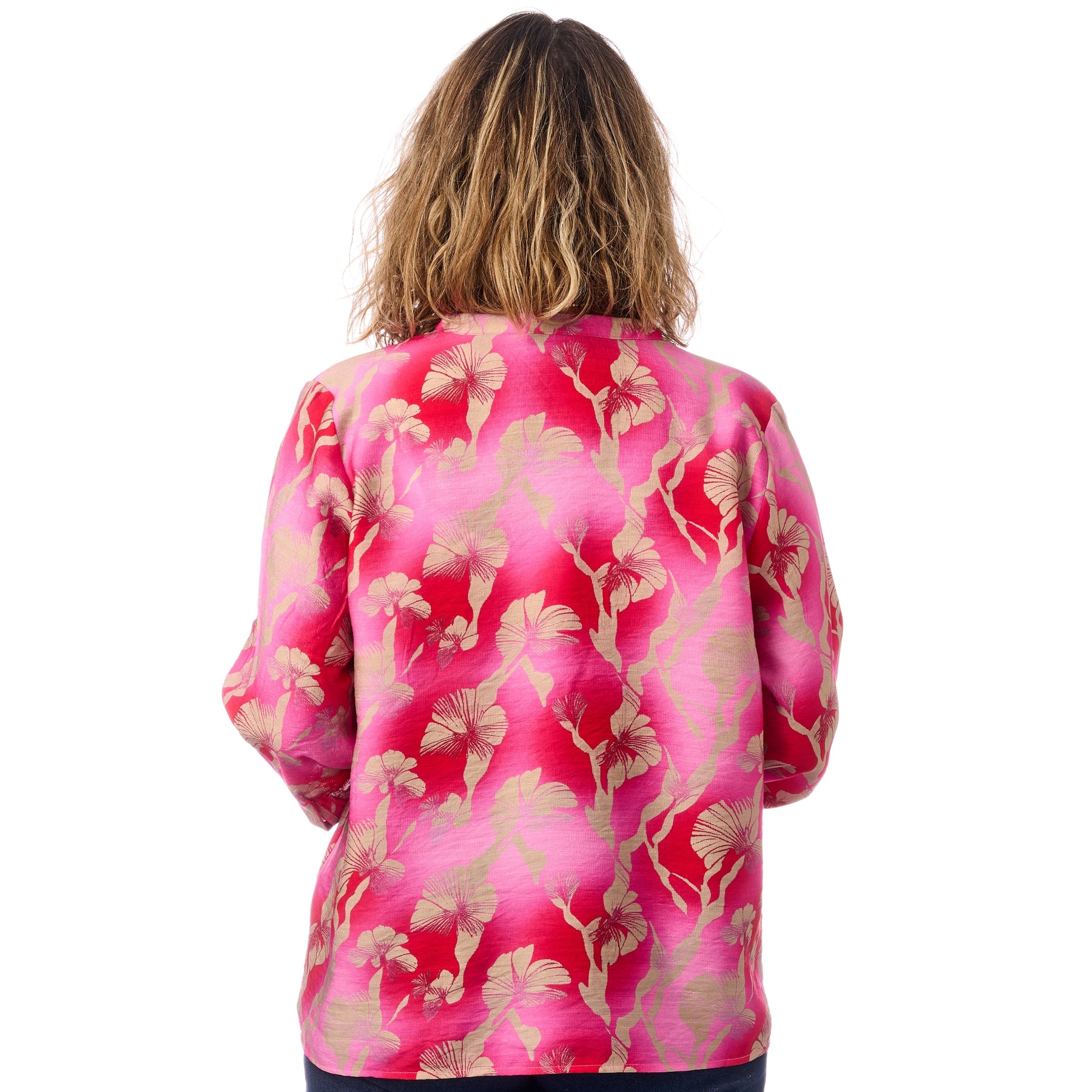 Blusen har en løs pasform, der falder frit fra dit bryst og ned over maven. Det betyder, at stoffet ikke klistrer sig til din mave, når du sætter dig ned eller læner dig frem. Du får en flot silhuet – uden at føle dig pakket ind i en pose. Modellen på billedet har str. L på.
