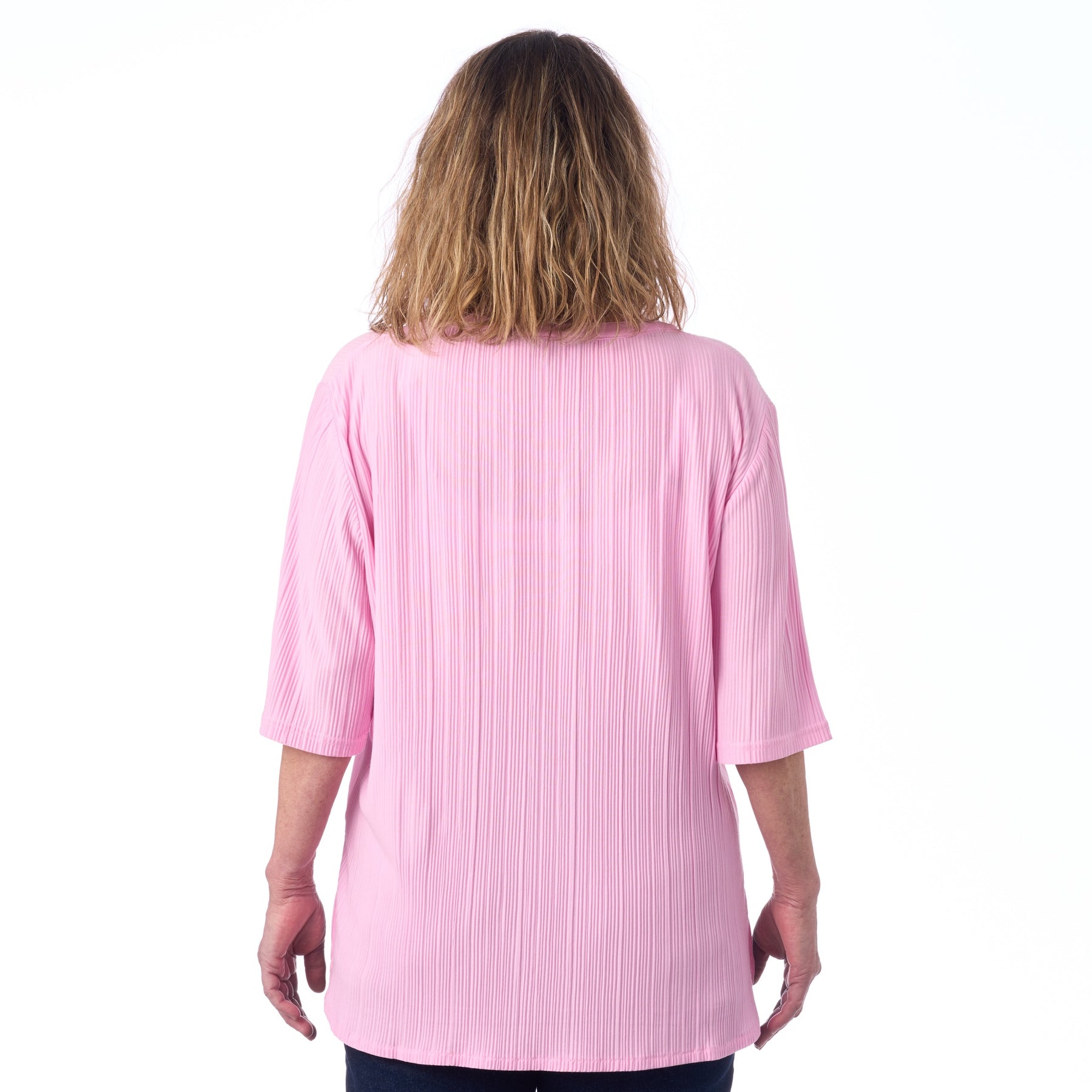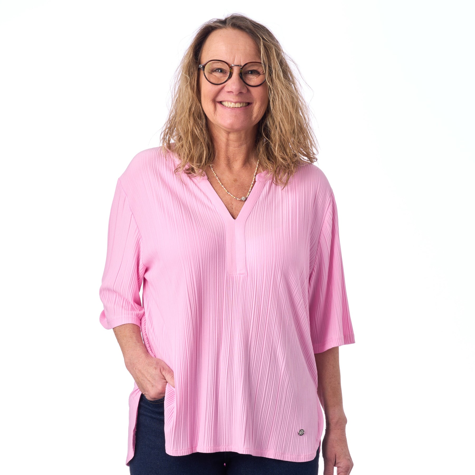 Stoffets ribbede struktur giver blusen et eksklusivt og gennemtænkt look. Det løfter den fra en almindelig bluse til noget, der ser dyrere ud, end den er — og det ribede mønster sørger for, at stoffet falder endnu smukkere.