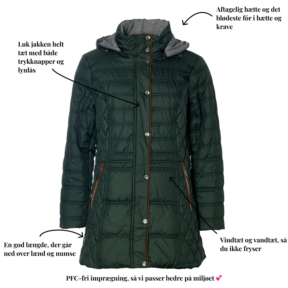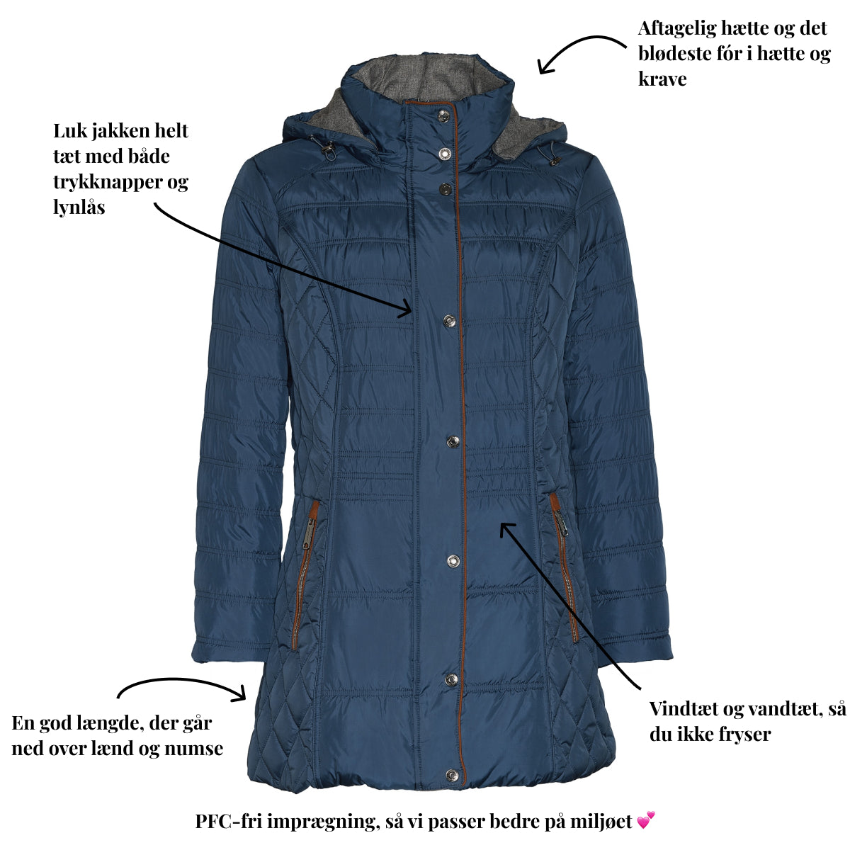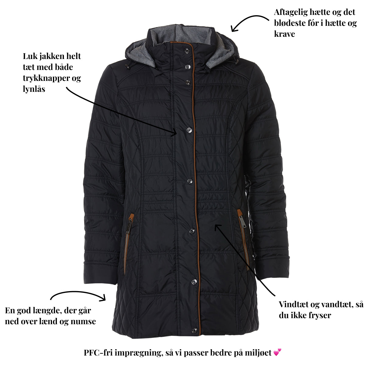 - En god længde, der dækker lænd og numse, så du er beskyttet mod kold vind.