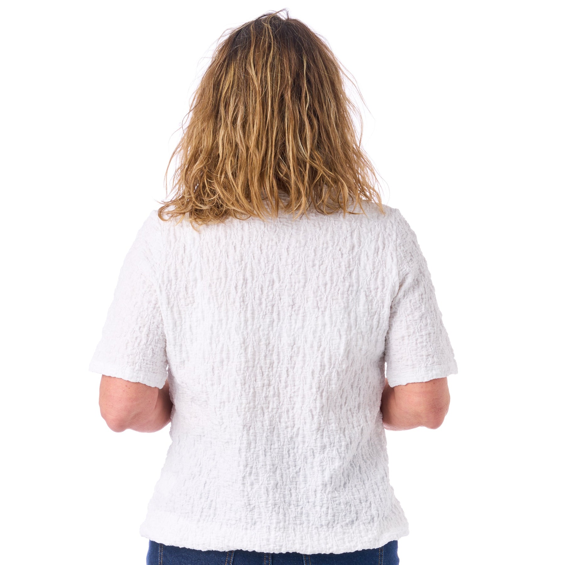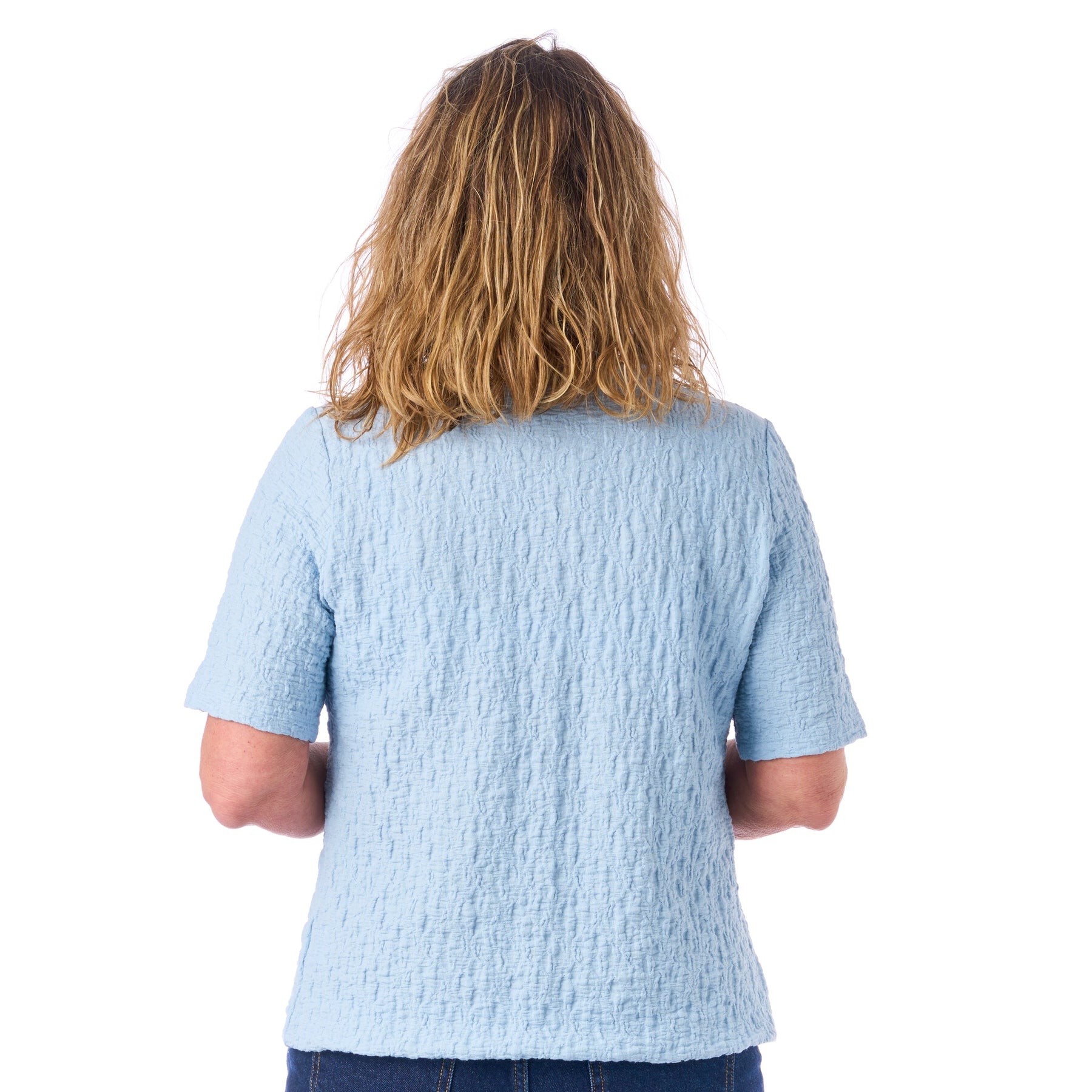 Vi har bevidst lavet blusens korte ærmer en lille smule længere end normalt. Det sørger for, at ærmerne ikke kravler op og generer, når du tager en jakke eller trøje på.