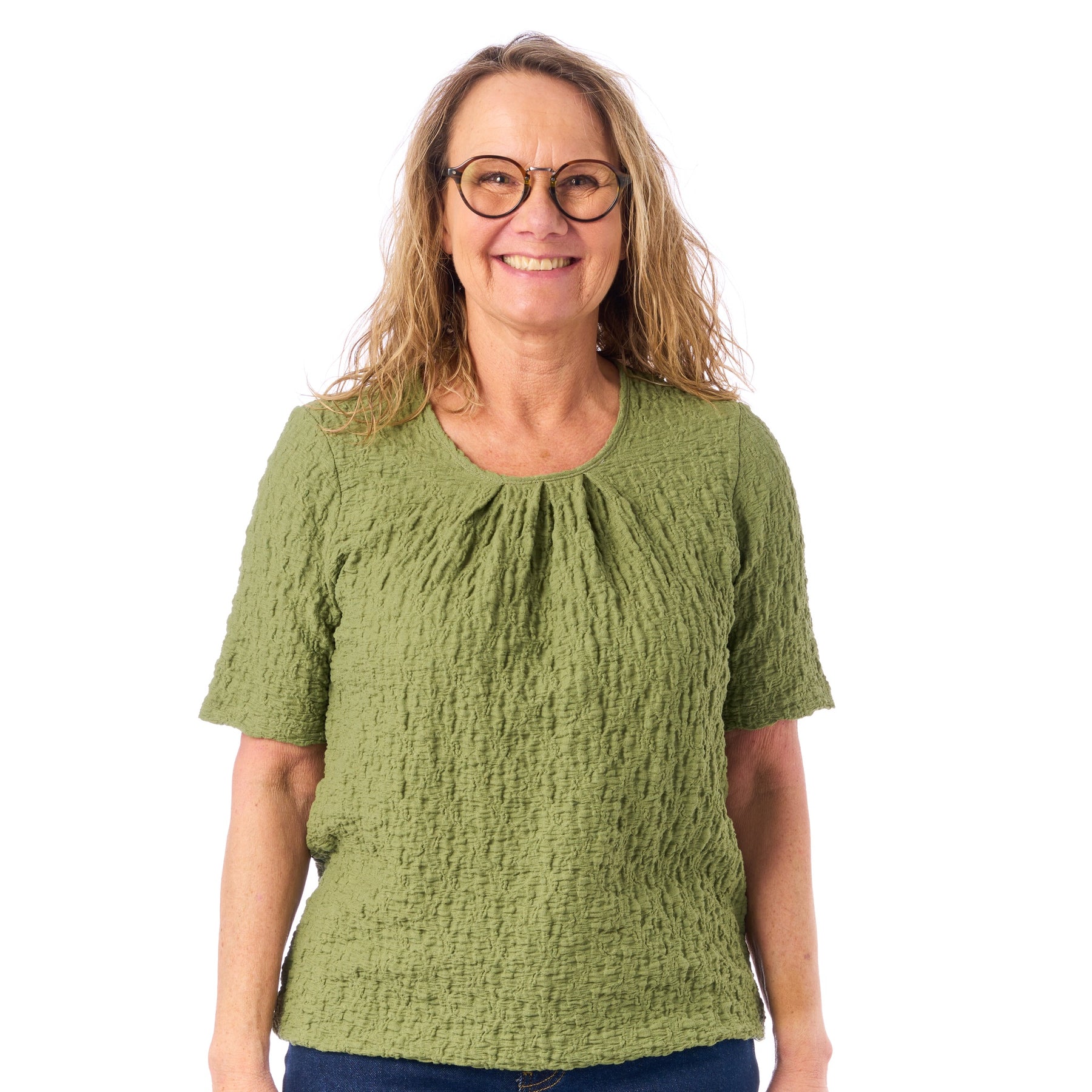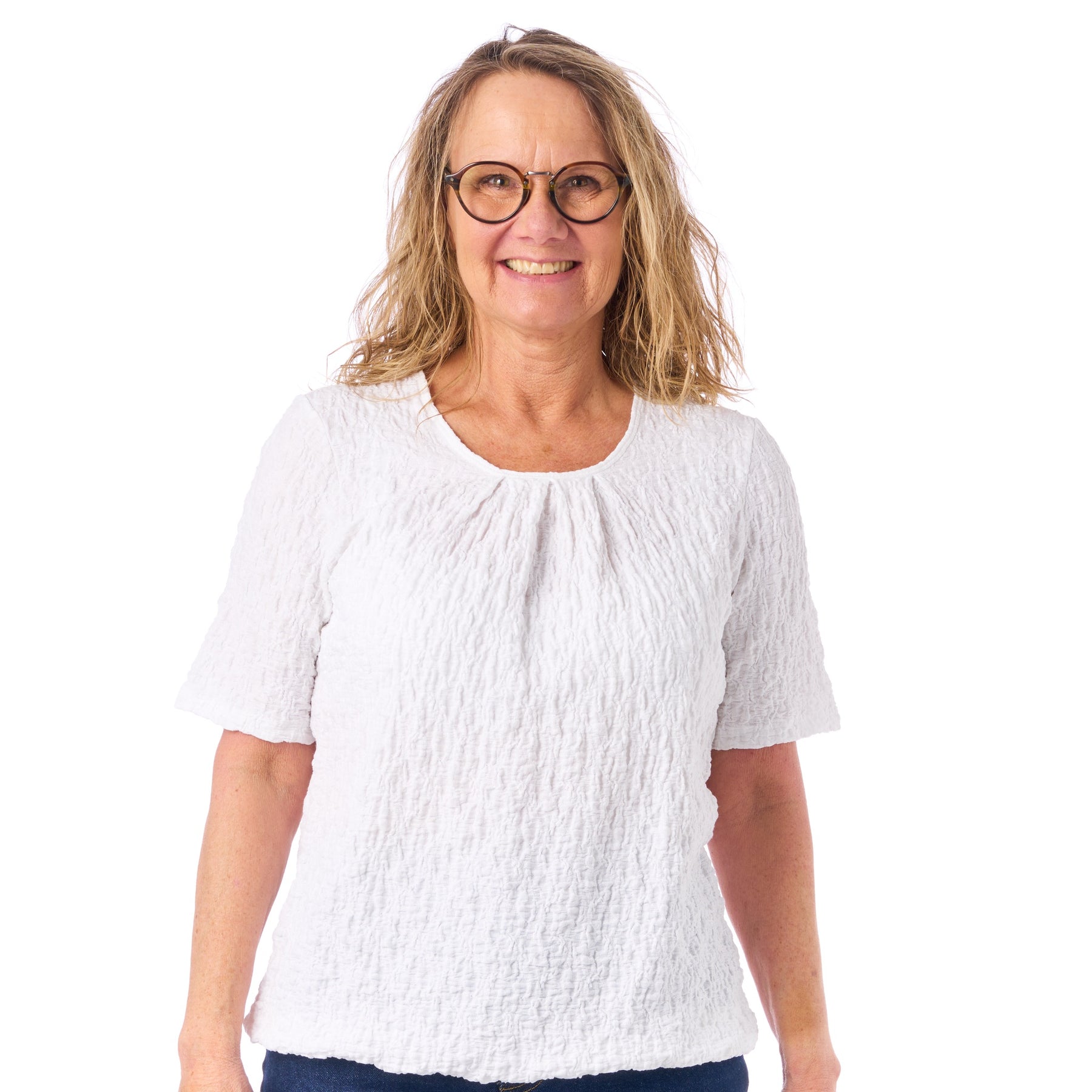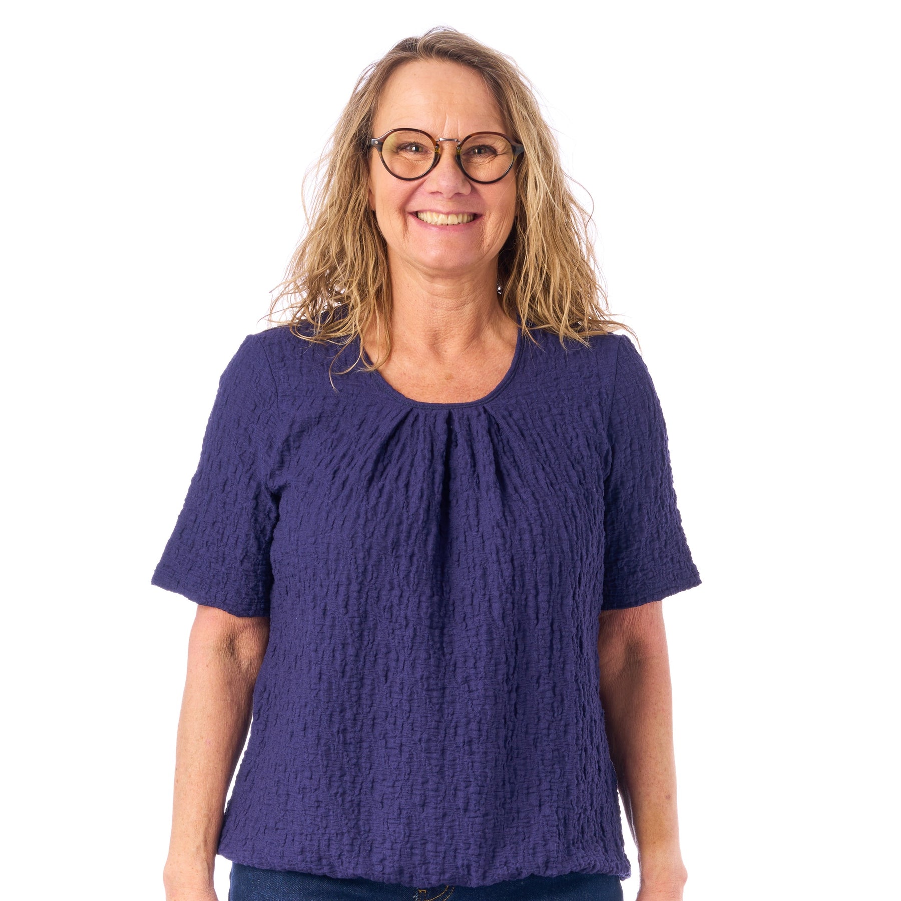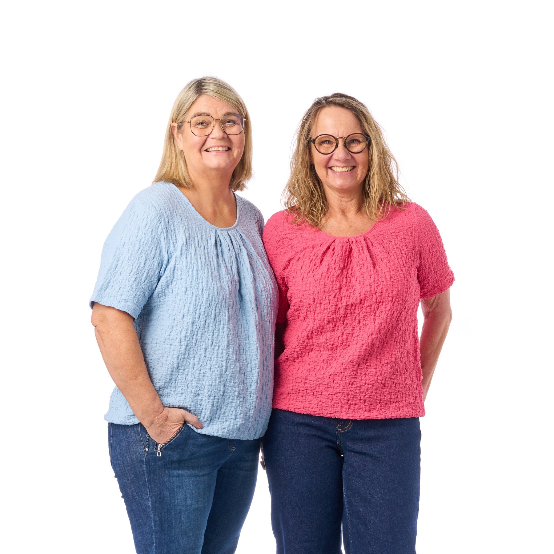 Model Sara er vores bedstsælgende blusemodel — nu i en helt ny, smuk strukturkvalitet