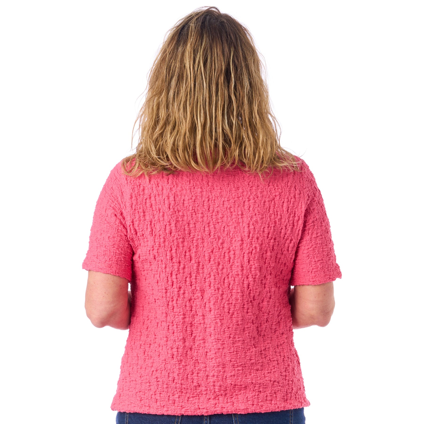 Stoffets tyngde og de tre læg på brystet gør, at blusen falder flot fra din barm og nedover din mave. Den smukke struktur i stoffet bryder lyset og camouflerer yderligere — så du ser endnu slankere ud. Og elastikken i bunden gør, at du kan sætte den lige der på hoften, du bedst kan lide. Blusen klæber sig aldrig til din mave.