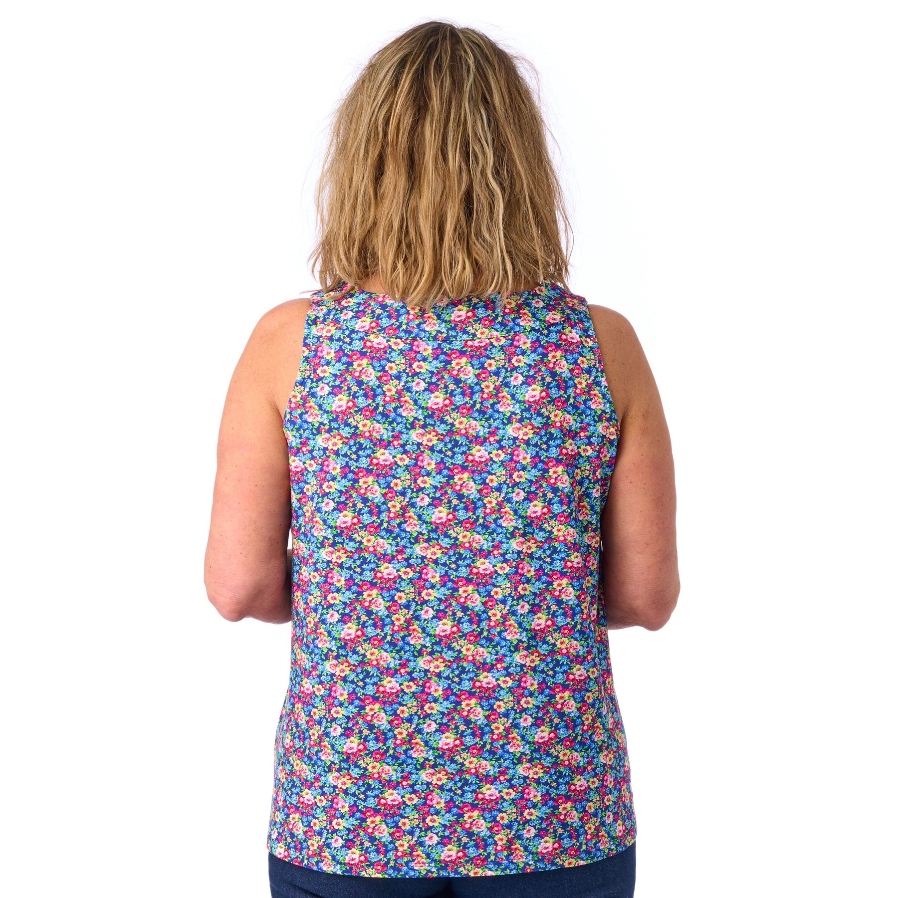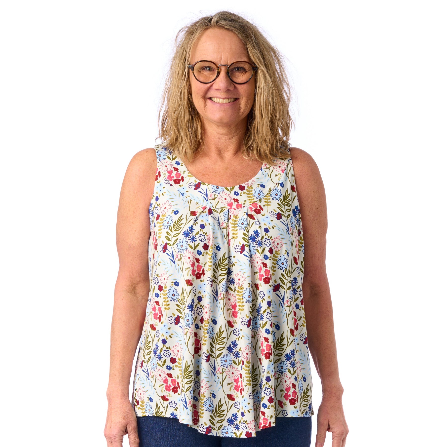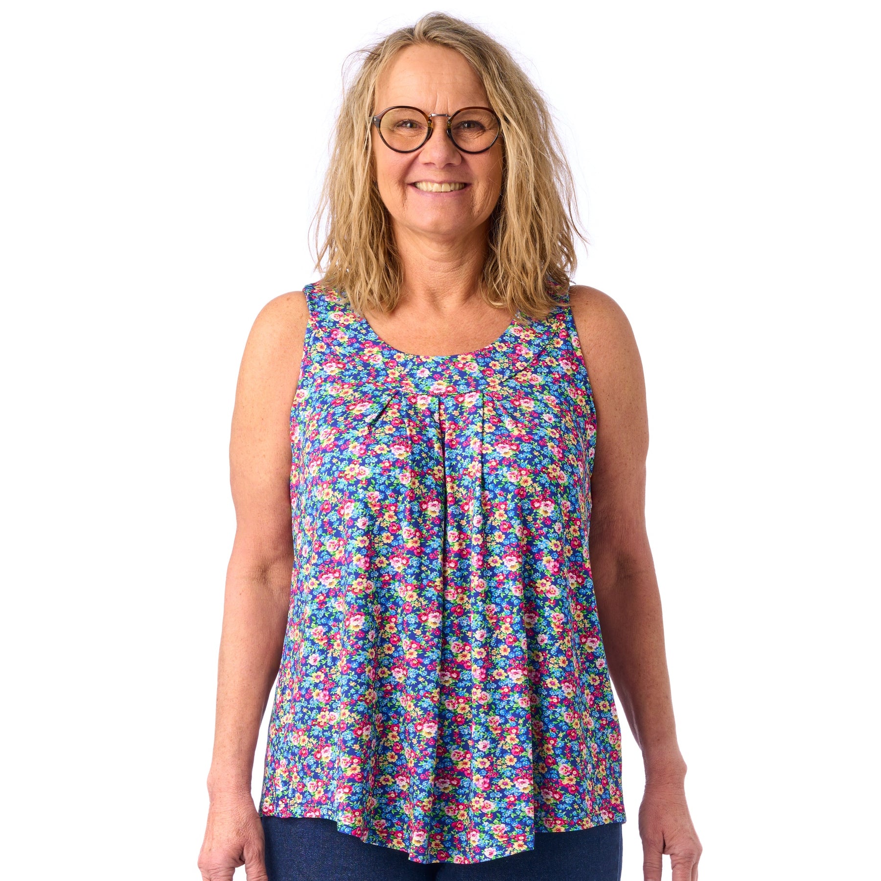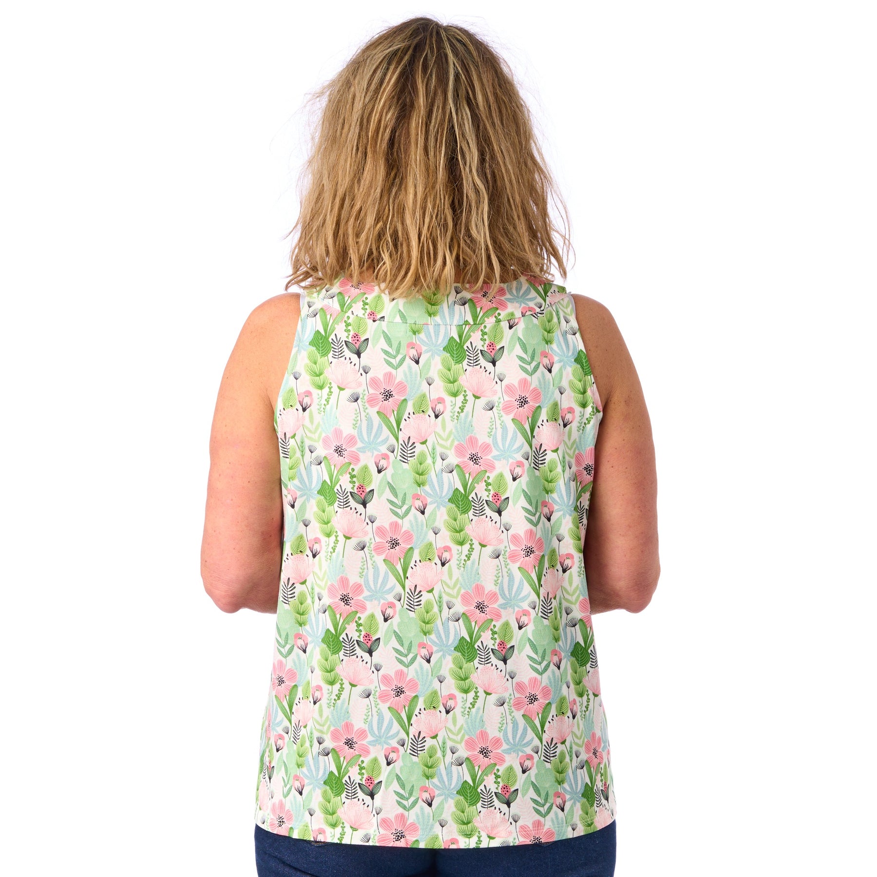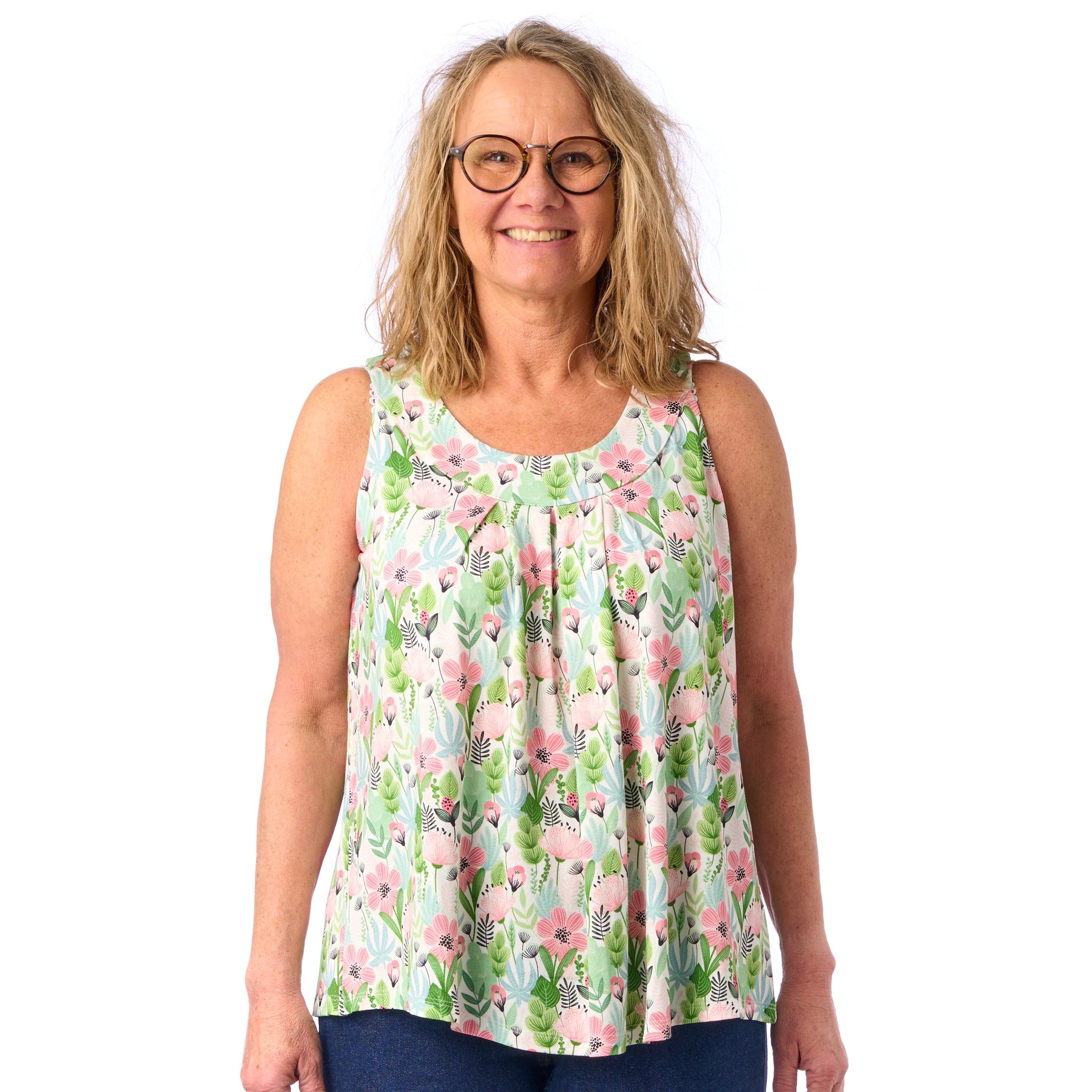 I model Sonja kan du virkelig nyde sol og sommer, og uden at tænke på, om noget skarver eller strammer. Vi har nemlig tilpasset syningen i armhulen, så sommertoppen sidder fint til uden at stramme i armhulen eller over brystet 💕