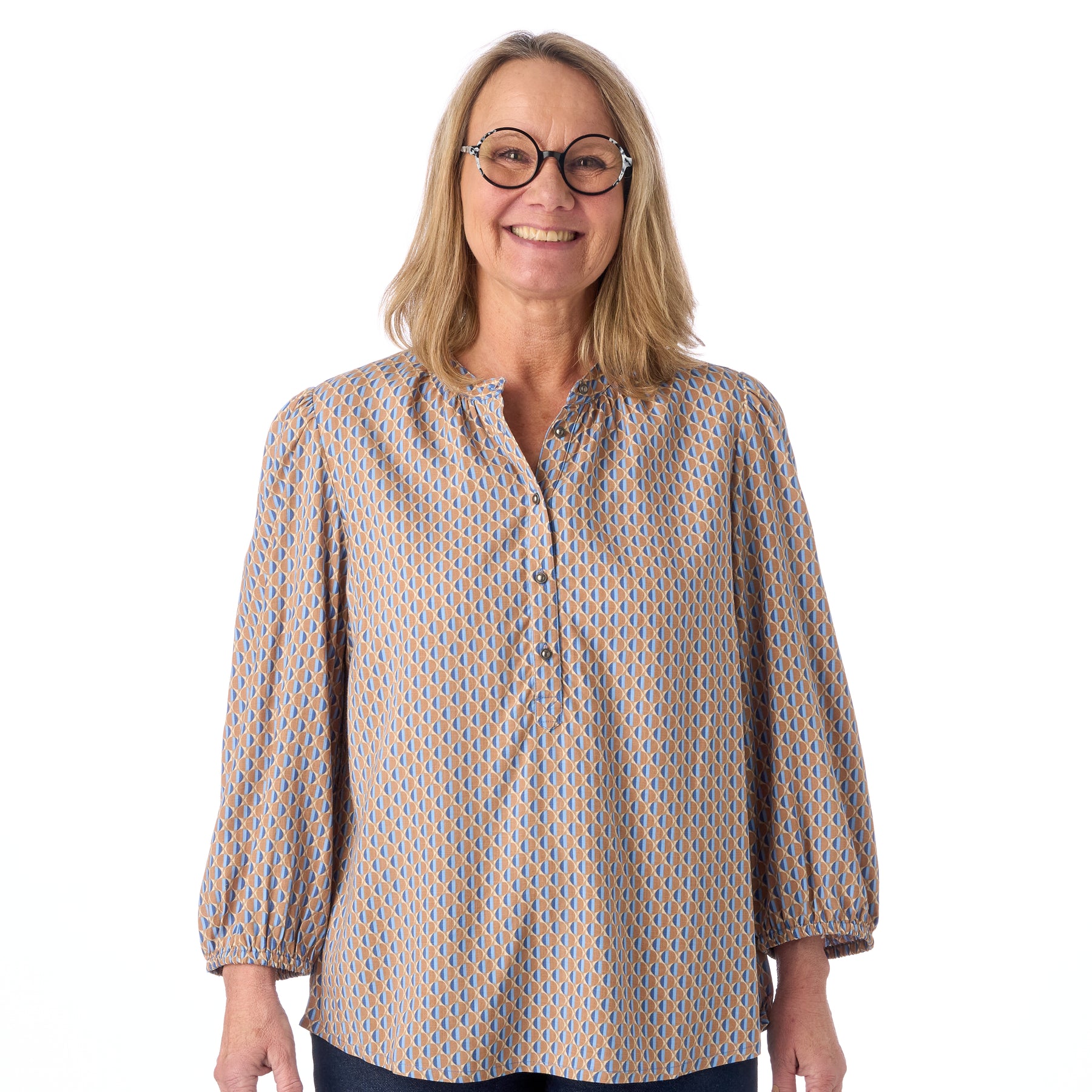 Det grafiske mønster i brune og beige toner med lidt blå giver blusen et varmt og moderne udtryk. Farverne gør den nem at style med både jeans og mere klassiske bukser.