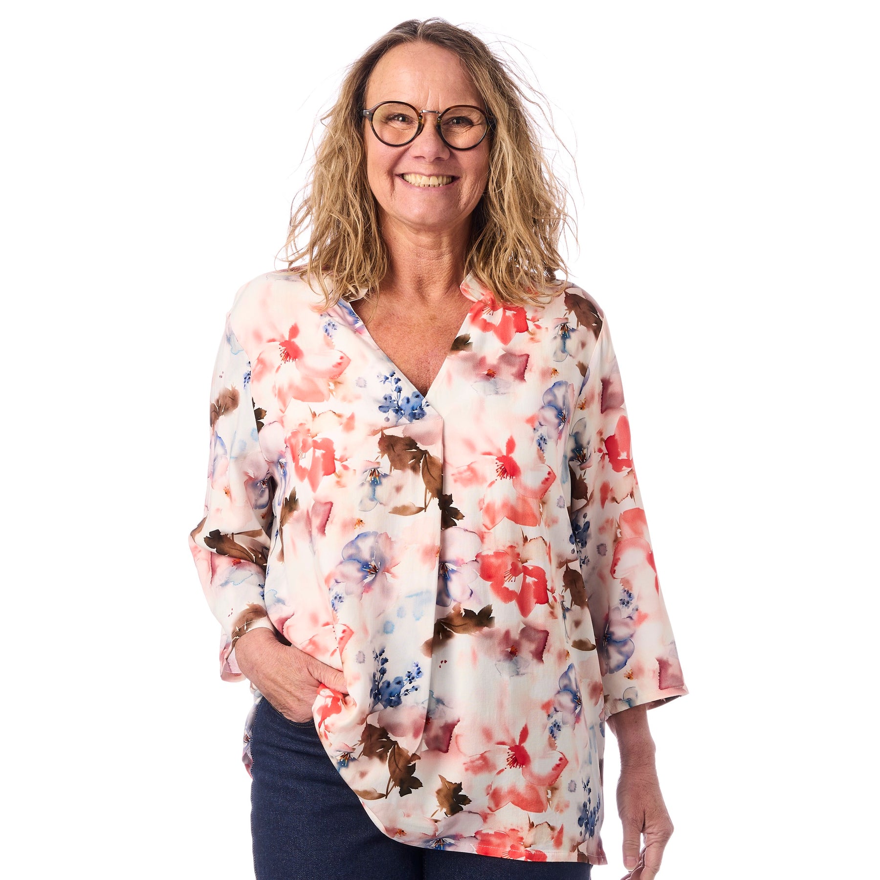 Blusen er prydet med et blødt, drømmende akvarelprint af store blomster i koralrød, lavendel og olivengrøn på en lys bund. Printet har en kunstnerisk, håndmalet kvalitet, der giver blusen et eksklusivt og unikt udtryk. Det er den slags print, der får folk til at spørge, hvor du har købt den.